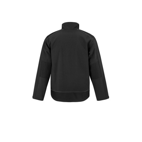 Softshell rip-stop 3 couches. Couche extérieure : mini rip-stop 96 % polyester / 4 % élasthanne. Couche intermédiaire : membrane laminée en polyuréthanne thermoplastique respirante (1000g/m²/24h), coupe-vent et imperméable (2000 mm). Couche intérieure : micro-polaire 100 % polyester. Dos plus long, col montant, patte intérieure anti-intempéries et protège-menton. Passepoil réfléchissant sur les épaules et en bas du dos. Pièces de renforcement noires en nylon Oxford sur les épaules, les coudes et le bord inférieur à l'arrière. Coutures à double surpiqûre et zip SBS. Manches articulées et poignets ajustables. 2 poches avant zippées avec rabat, 1 poche poitrine zippée à droite, 2 poches intérieures. Bord inférieur ajustable à l'aide de cordons et de stoppers. Accès facile pour la décoration (avant - arrière - manches).