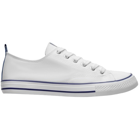 Basquet classique en toile avec semelle en caoutchouc blanc décorée de lignes colorées. Oeillets de ventilation latéraux, embout en caoutchouc et fermeture à lacets.